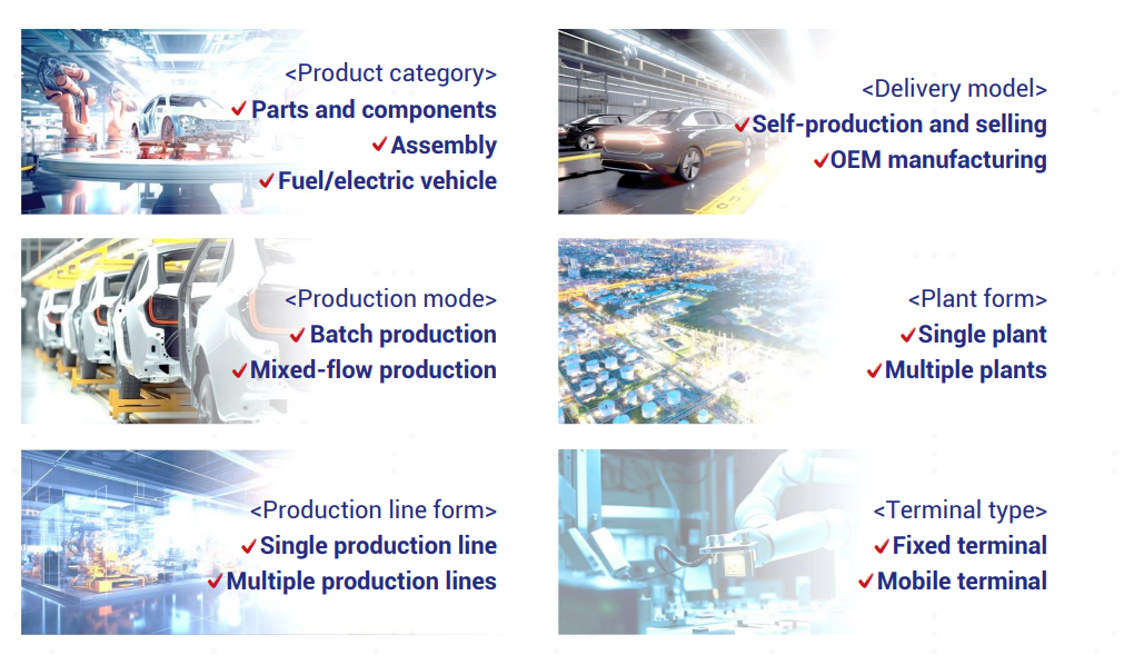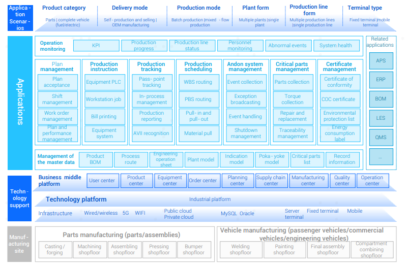 As a digital manufacturing execution system, the Lan-you MES covers the production management and control at the execution layer of various shopfloors in discrete manufacturing enterprises, such as casting and machining, engine/battery assembly, bumper, pressing, welding, painting and final assembly shopfloors in the automotive industry. It provides digital services for the entire production process from parts machining, assembly manufacturing to complete vehicle manufacturing. It has the characteristics of flexibility, automation, modeling, visualization, configuration and traceability, helping enterprises to achieve lean production.