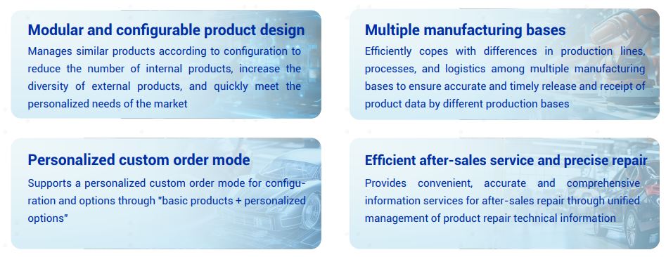 It is suitable for complex product data management in equipment manufacturing business, such as automobile manufacturing, engineering machinery manufacturing, etc. It runs through all links throughout the full product life cycle, including business planning, R&D, manufacturing, sales, and after-sales service. Through configuration, it can quickly respond to customer needs, shorten product delivery time, and improve product traceability.
