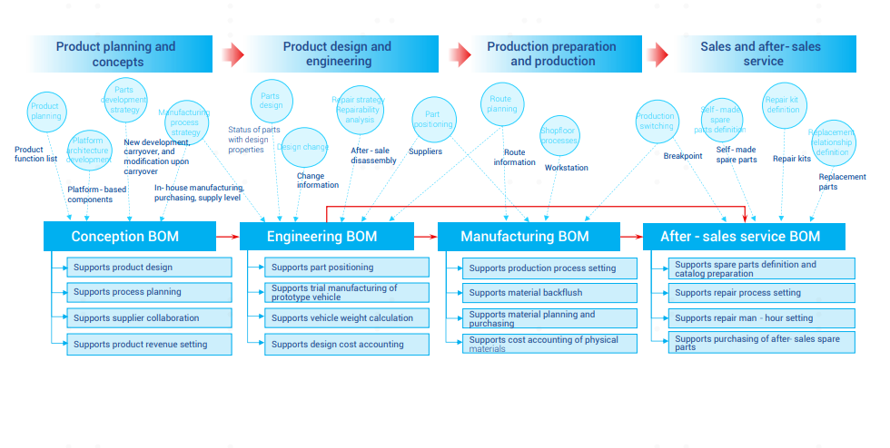 Integrated product data management throughout the life cycle and covering the whole value chain; Supports configurable (super BOM) and non-configurable (one BOM for one vehicle) product data management model