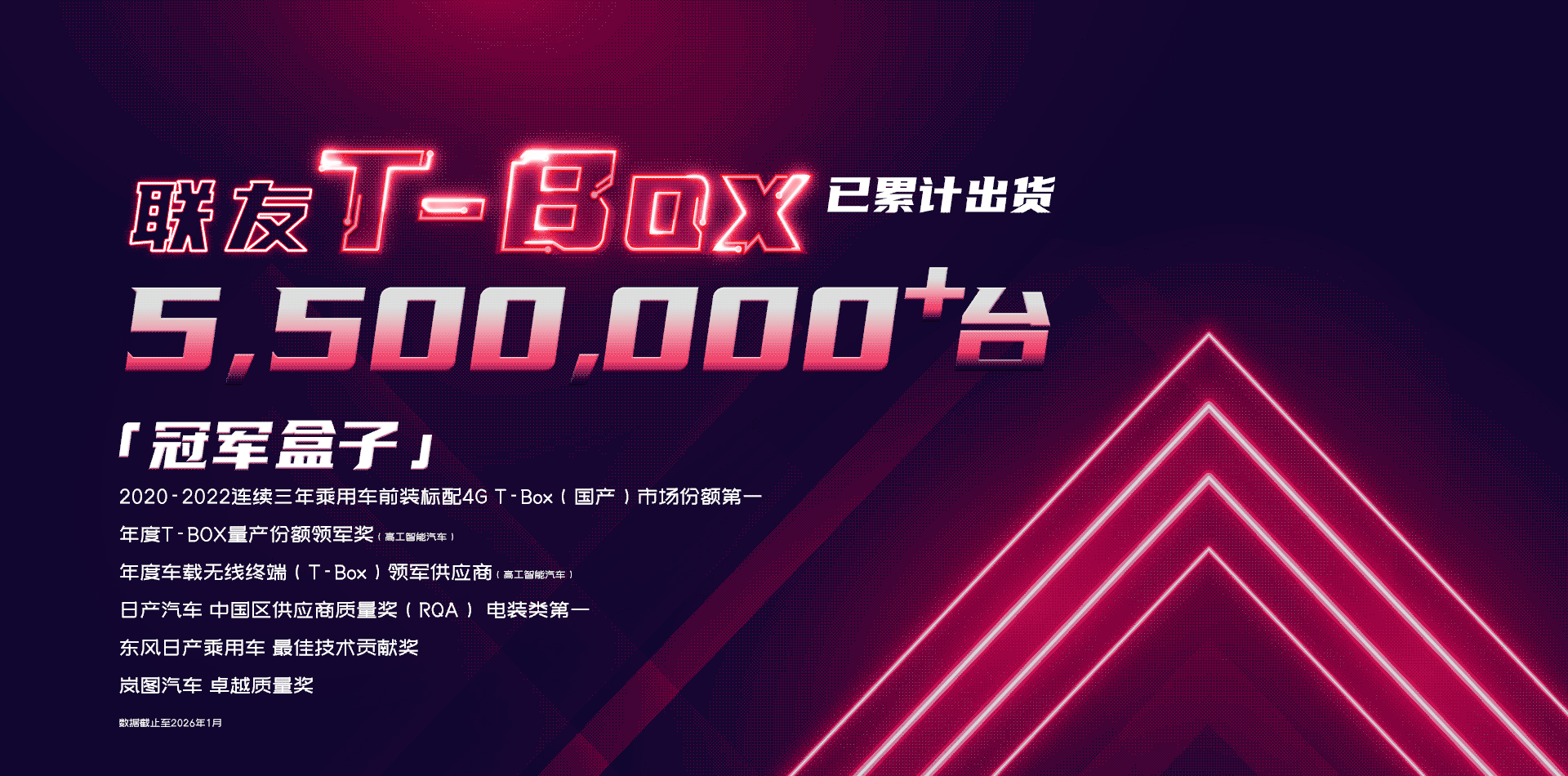 智能车载终端T-Box,是首款实现量产的CAT4车规级T-Box,T-Box量产规模全国第一,5G T-Box第一梯队实现量产。