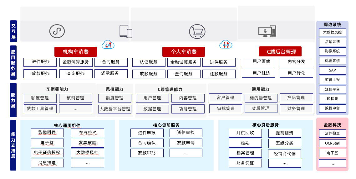 1、车消费金融基于联友智融云核心消费信贷中心系统,新增保险、维修保养、改装等金融业务,支持个人用户与机构用户车消费业务场景;