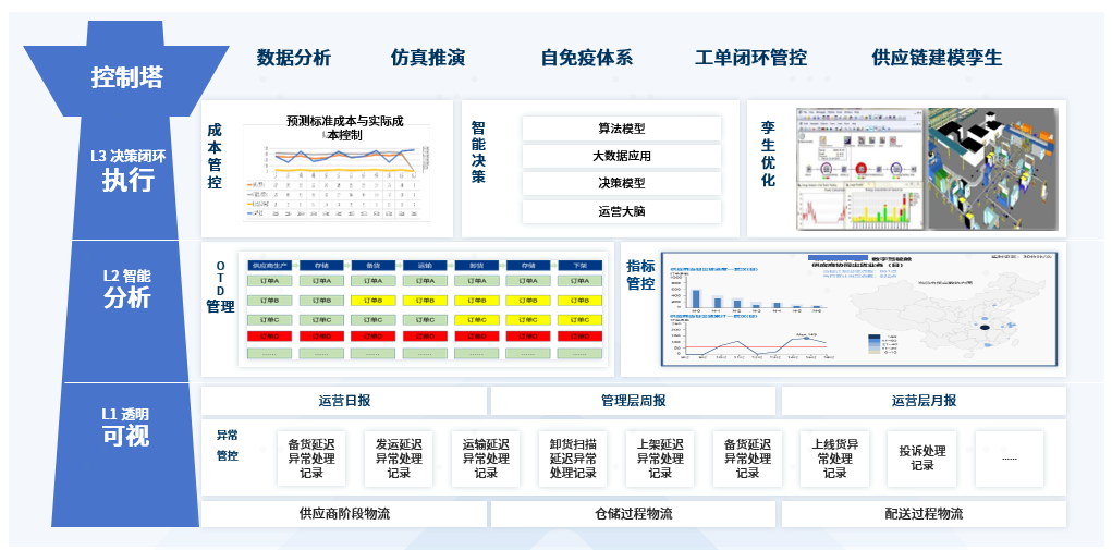 此外,供应链控制塔通过BI建模、数据分析和智能决策,实现从透明可视到闭环执行的三层管理。同时,通过各模型的触发条件,形成智能决策,并指导现场执行,实现工单闭环管理,不断优化提升全链条数据共享与业务协同。