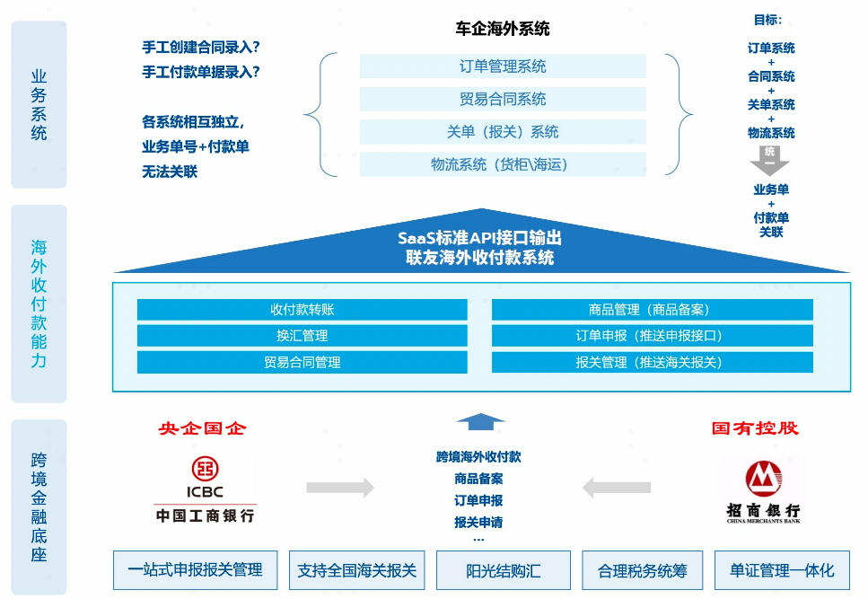 一站式接全球,收付合规稳健,三流合一增效联友科技联合中国工商银行、招商银行等金融支付机构,共同打造汽车行业海外收付款SaaS平台,实现海外收付款单+业务单据关联+场景关联+换汇管理+服务商咨询服务,确保通关、单证、税筹等全面合规,让每一笔跨境支付都省心、省钱、省力。