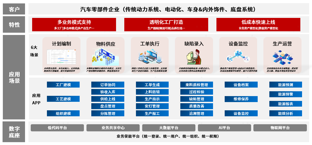 ü 联友MOM全量版(面向整车企业):以联友工业互联网平台为基础构建数字底座,通过业务模型化、数据模型化、算法模型化、多业态多模式共享复用,实施团队可自由组合、配置,实现企业级能力共享,及时快速应对业务变化,帮助企业实现业务的协同化、精益化、敏捷化和智能化。
