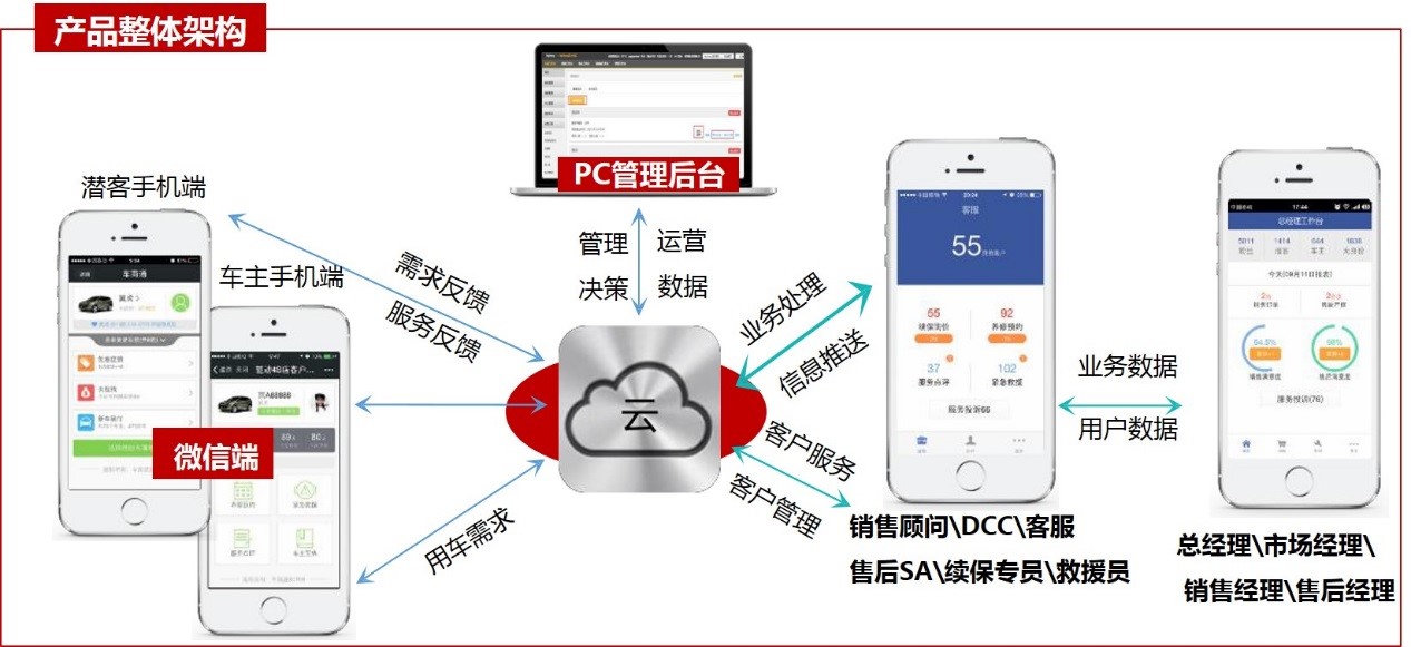 智通车商,基于专营店的微信CRM平台,与店端的业务系统对接,针对不同类型的用户,打造不同的平台界面。