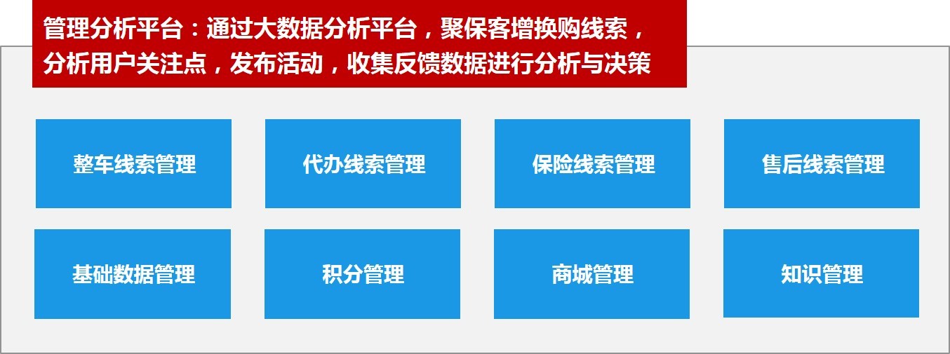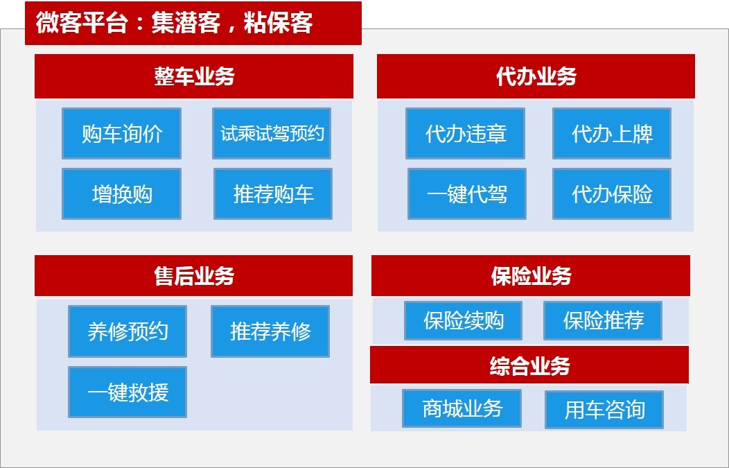平台提供了整车业务,代办业务,售后业务,保险业务还有综合业务总共五大块的服务内容,基本涵盖了专营店的服务内容,参与了客户从进店到增换购的全生命周期。