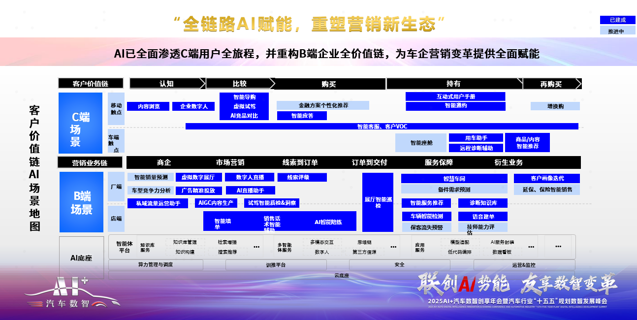 在用户端,AI覆盖“认知-比较-购买-持有-再购买”全旅程,通过智能导购、虚拟试驾、个性化推荐等场景,提升用户体验与粘性;在企业端,AI重构B端价值链,赋能商企、营销、服务等业务环节,实现数据驱动决策与高效协同。