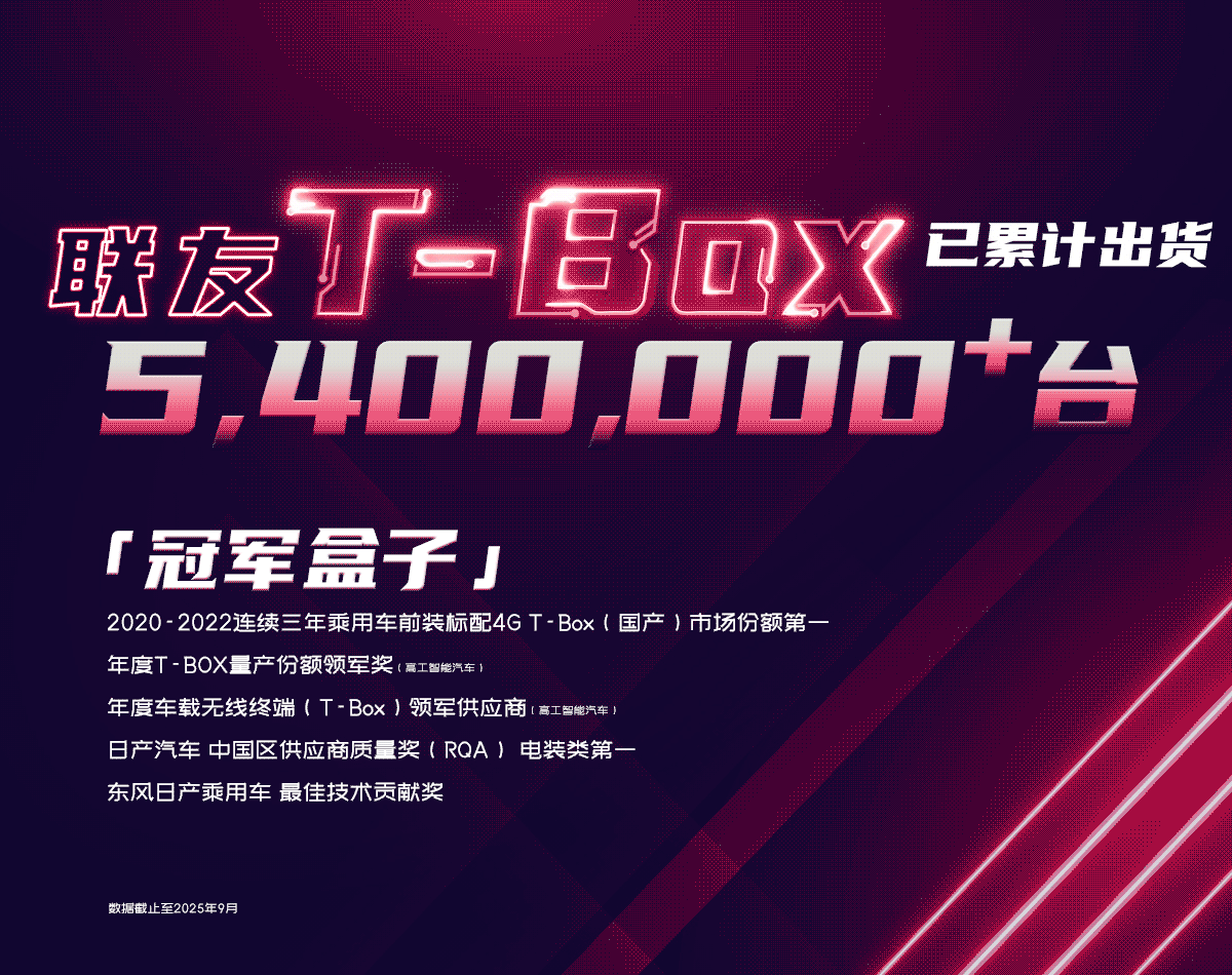 智能车载终端T-Box,是首款实现量产的CAT4车规级T-Box,T-Box量产规模全国第一,5G T-Box第一梯队实现量产。